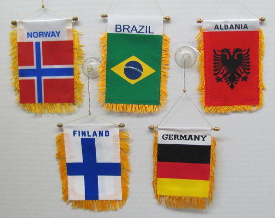 Your Country Flag on a fringed, double sided 4” x 6” (10 cm x 15 cm) Mini Window Banner, with brass look staff and suction cup for hanging from rearview mirror or car window. Show your Country pride. Photos show samples of mini banners but I will eventually get actual pictures for each country but it is very time consuming for this senior.